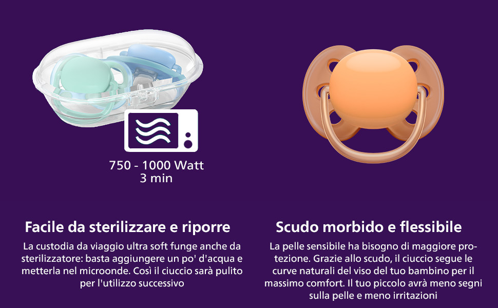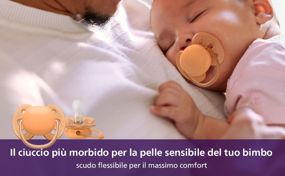 Il ciuccio ultra soft Philips Avent è stato progettato per essere il ciuccio più morbido per la pelle delicata del tuo bambino ed è dotato di uno scudo flessibile per il massimo comfort dei bambini da 0 a 6 mesi. Prenditi cura della pelle delicata con il ciuccio ultra soft Philips Avent. Lo scudo flessibile e ultra morbido* segue le curve delle guance del tuo bambino, riducendo i segni e le irritazioni per il massimo comfort. La custodia da viaggio per ciucci ultra soft funge anche da sterilizzatore. È sufficiente aggiungere un po' di acqua e metterla nel microonde. Così il ciuccio sarà pulito per l'utilizzo successivo. La pelle delicata del tuo bambino ha bisogno di maggiore protezione. Grazie allo scudo, il ciuccio segue le curve naturali del viso del tuo bambino per il massimo comfort. Il tuo piccolo avrà meno segni sulla pelle e meno irritazioni. Il nostro scudo arrotondato riduce al minimo la pressione sulle guance del bambino per un comfort ottimale. Quando abbiamo chiesto alle mamme come reagiscono i bambini alle nostre morbide tettarelle in silicone, il 98%* ha confermato che i bimbi accettano i ciucci ultra soft e ultra air Philips Avent. Prenditi cura dello sviluppo orale del tuo piccolo con una tettarella simmetrica che rispetta la forma naturale del palato, dei denti e delle gengive. La morbida e vellutata tettarella in silicone del ciuccio dona al tuo bambino calma e comfort.*Test del 2016-2017 effettuati tra i consumatori degli Stati Uniti mostrano una media del 98% di accettazione della tettarella a trama Philips Avent utilizzata nei nostri succhietti ultra air e ultra soft.